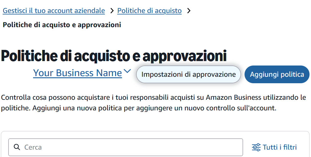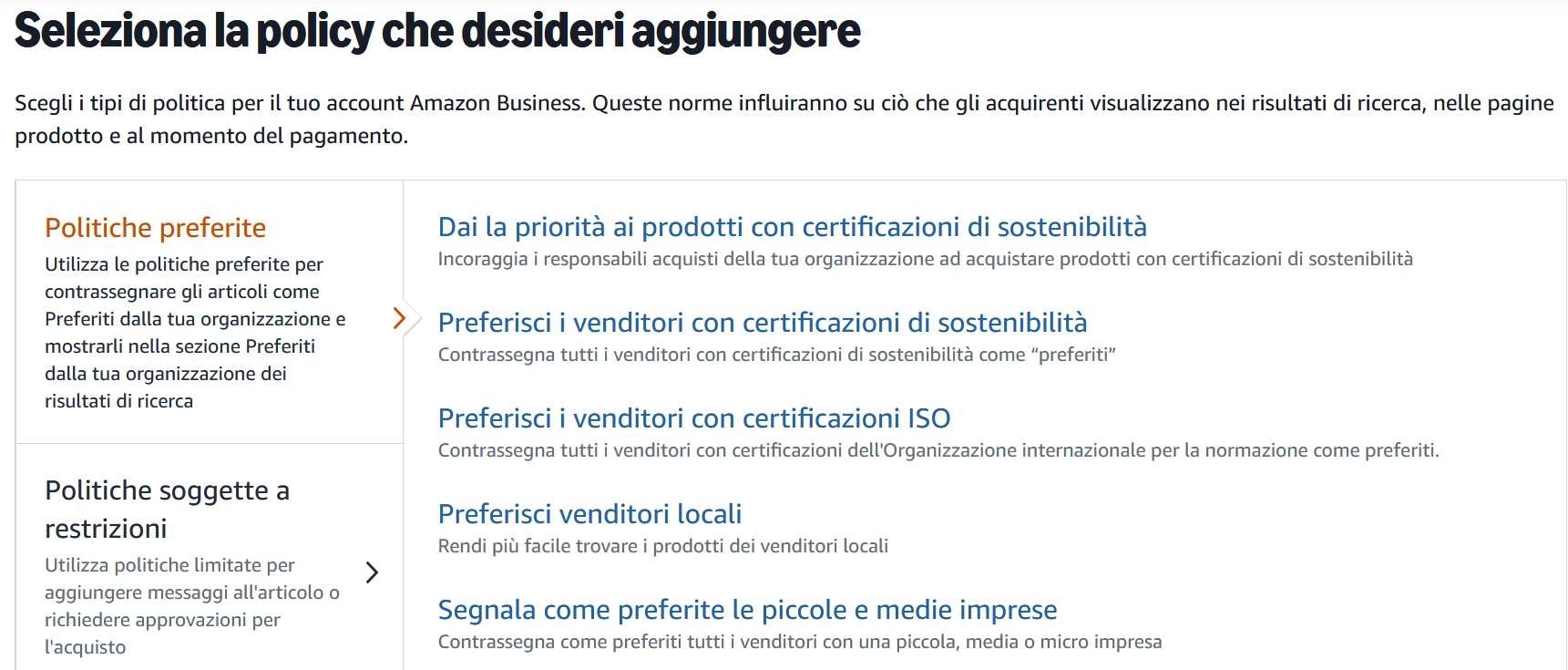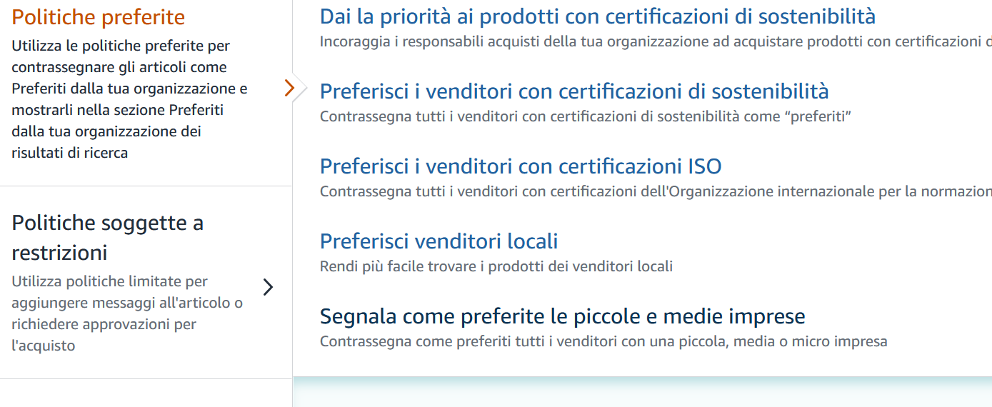 Adotta politiche di acquisto a livello di organizzazione o di reparto per mettere in evidenza e favorire le PMI*. Gli amministratori possono personalizzare un messaggio per i responsabili acquisti, che spieghi la politica, e impostare una soglia di tolleranza del prezzo per gli acquisti dalle PMI.